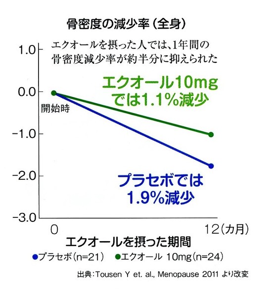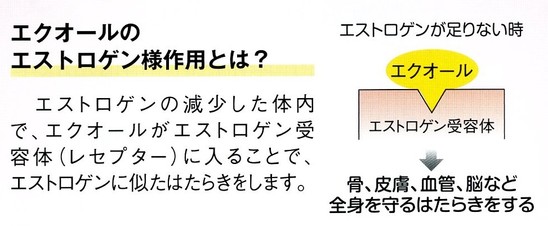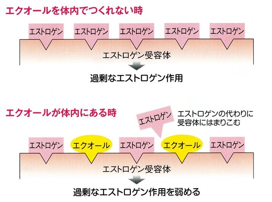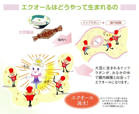 最近、その働きのもとになっているのが「エクオール」という物質であることがわかりました。大豆の中のイソフラボンという成分が、腸内細菌によって「エクオール」に変わり、エストロゲンによく似た女性の健康パワーとなっていたのです。