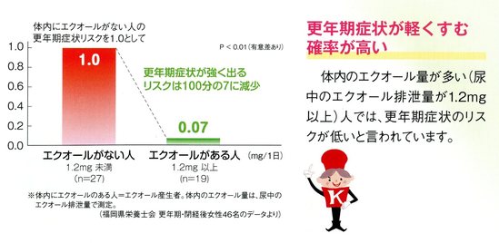 更年期症状の緩和対策に大豆製品やイソフラボンのサプリメントを摂っても、その効き目が実感できない人が少なからずいらっしゃいます。これらの方は、実はエクオールを作り出す腸内細菌(エクオール産生菌)を体内に持っていないのです。エクオールを体内で作れる人は日本人で2人に1人と言われています。近年は食生活の欧米化のために、若年女性のエクオール産生者は2割位にまで低下していると言われています。