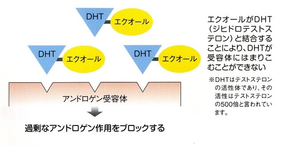 前立腺がんや男性に起こりやすい毛髪の脱毛現象は、アンドロゲンの過剰な作用が影響するとされています。そこで、エクオールの「抗アンドロゲン作用」が良い働きをすると期待されています。