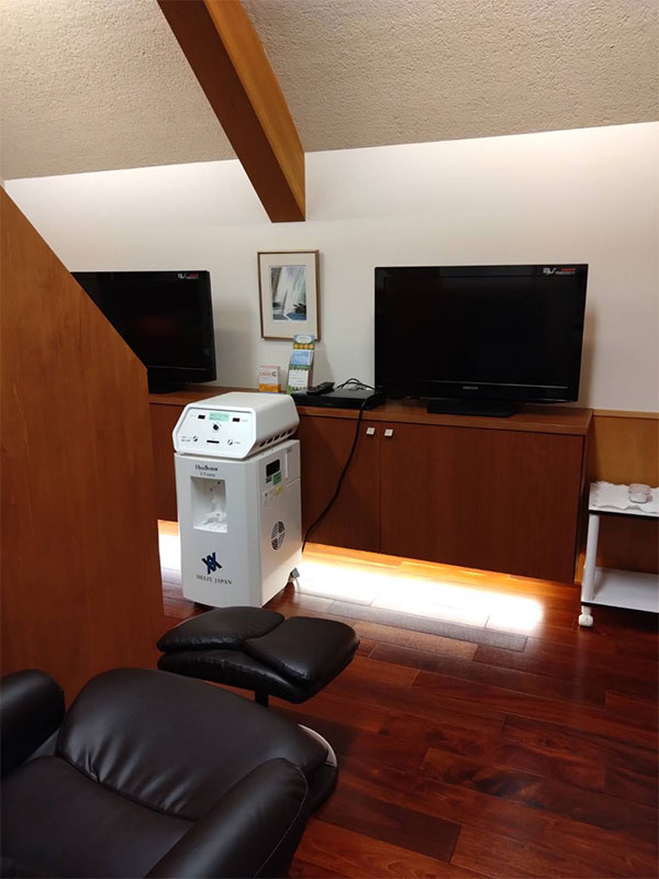 当院では、業界トップクラスの水素発生量を誇る、(株)ヘリックスジャパン製の水素吸入器(ハイゼルベーターET100、水素ガス発生量1200ml/分)を、クリニック2階の自由診療専用の点滴室に設置しております。マイヤーズカクテル点滴や高濃度ビタミンC点滴をしながら水素吸入を併用することも可能です。
