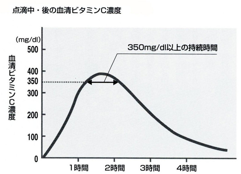 最初はビタミンC12.5gから点滴を始め、25g、50gと増量します。血液中のビタミンC濃度を測定し、投与するビタミンCの理想的な投与量を決定します。典型的な例では週に2回の点滴で6ヶ月間継続、その後の経過が良ければ週1回を6カ月、さらに2週に1回を1年、その後は月に1回行います。ビタミンCの量と点滴頻度は病状によって変えていきます。